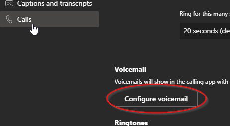 - Once in settings, select “Calls” from the menu on the left-hand side and click the “Configure Voicemail” button: